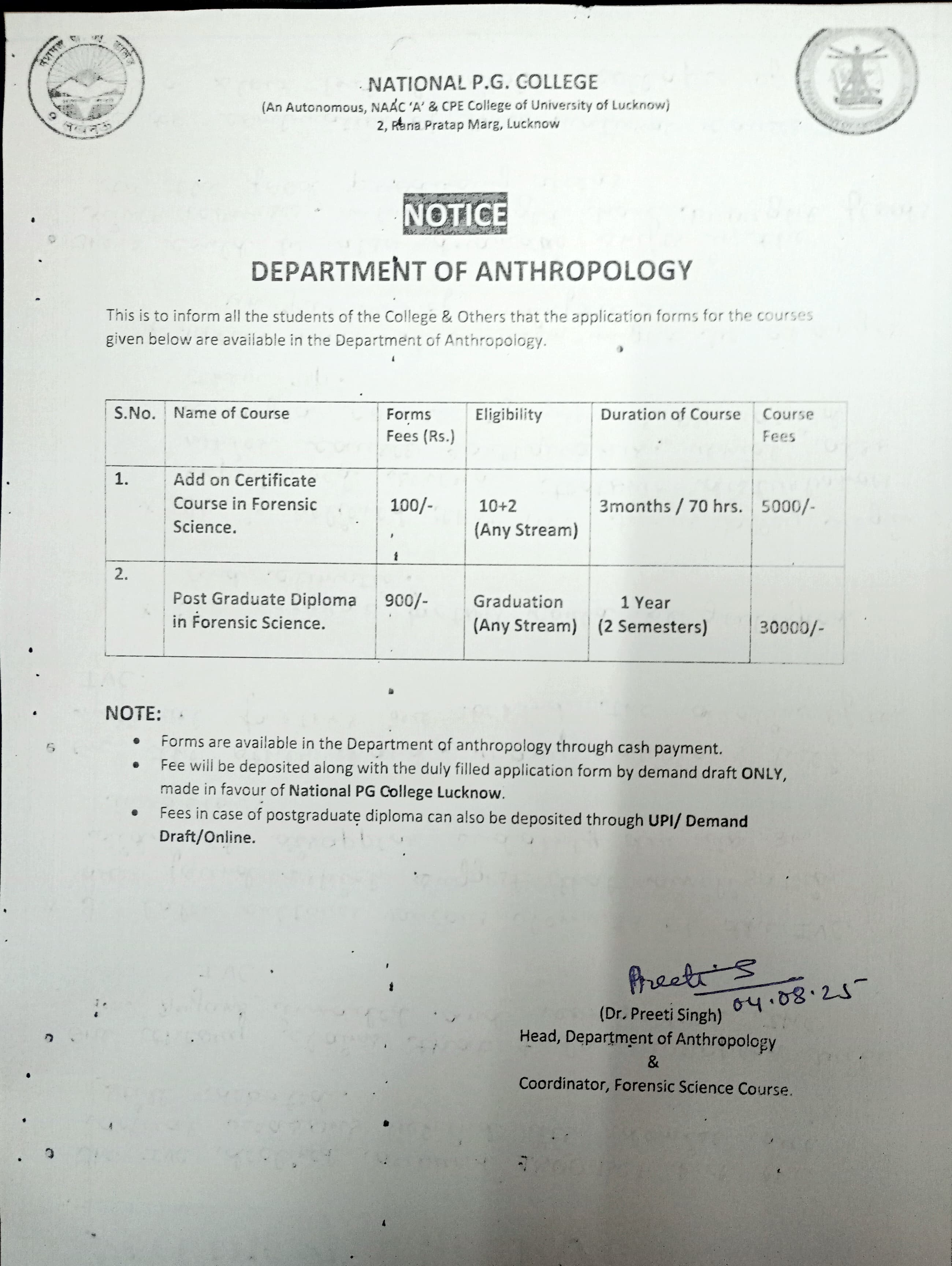 Admission: Certificate and PG Diploma in Forensic Science